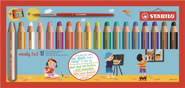 COLORING PENCILS STABILO WOODY 3IN1, CARDBOARD WALLET 18 PCS + 1SHARPENER + 1 BRUSH