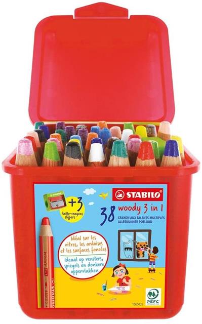 COLORING PENCILS STABILO WOODY 3IN1, PLASTIC BOX 38 PCS + 3 SHARPENERS