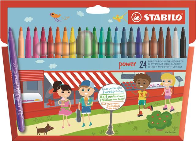 STABILO power assure une application généreuse des couleurs. Il est idéal pour les enfants qui oublient parfois de remettre les capuchons. Jusqu’à huit semaines sans se dessécher ! - Le feutre peut rester ouvert 8 semaines sans sécher -Pointe bloquée résistante à la pression - Encre lavable et un capuchon ventilé - Largeur de trait 2,0 mm - pointe moyenne - Disponible en 30 couleurs