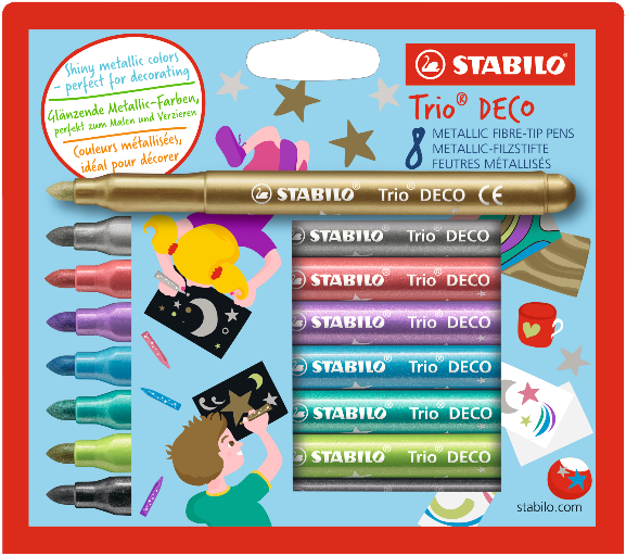 Et si on ajoutait une touche de créativité aux fêtes de fin d'année ? Pour décorer ou tout simplement colorier, le feutre pointe moyenne STABILO Trio DECO s'adapte à tous les besoins et tous les supports lisses : papier, verre, bois, tasse... Pour le plus grand bonheur des petits et grands artistes. - Disponible en 8 couleurs métallisées. - Feutre idéal sur papiers foncés grâce à un fort pouvoir couvrant et un effet métallique haute performance. - Encre permanente sur le papier, le bois et la plupart des surfaces poreuses. - Zone de préhension triangulaire pour une meilleure prise en main. - Largeur de trait de 1,5 à 2,0 mm - pointe moyenne.