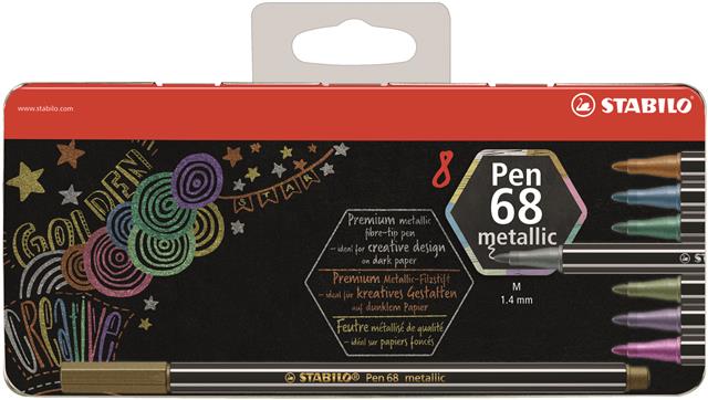 The 8 colors of STABILO Pen 68 metallic - gold, silver, copper, blue metallic, green metallic, light green metallic, pink metallic and lilac metallic - add a touch of sparkle to your creative ideas. With excellent coverage and a medium 1.4 mm tip, all your designs will sparkle even on dark paper.