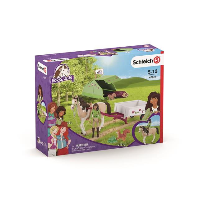 Horse Club Sarah's Camping Adventure from Schleich® Horse Club excites the fully moveable Sarah figurine from Schleich® Horse Club and her Pinto mare! Sarah uses the waist strap to attach her horse to the trailer, which she loads with the tent and supplies. Then she puts on her helmet and grabs the stable halter. Off they go! On arrival the spotted horse is rewarded for pulling the trailer with a delicious green apple. Then Sarah pitches the tent, unpacks the cozy sleeping bag and places the cute toy horse in it ready for the night. A squirrel watches curiously as Sarah hoists the secret Horse Club flag before going to bed!