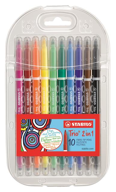 Disponible en 10 couleurs, STABILO Trio 2in1 est le stylo-feutre bi-pointe idéal pour dessiner et écrire. - Disponible en 10 couleurs ! - Feutre dôté d'une pointe moyenne (2,0 mm) pour le coloriage et le dessin et d'une pointe fine (0,5 mm) pour les tracés de précision. - Encre lavable et une forme triangulaire ergonomique.