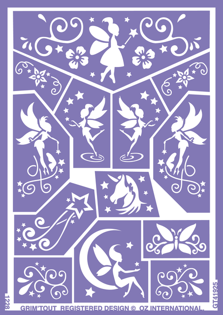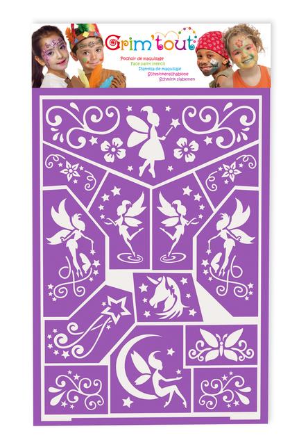GRIM'TOUT vereenvoudigt het leven van moeders, leerkrachten en animatoren met zelfklevende, wasbare en herbruikbare make-up stencils! De sjablonen zijn van cosmetische kwaliteit, zeer flexibel en passen zich aan elk deel van het gezicht aan, met een frontaal patroon en andere voor de wangen. De make-up kan met een kwastje of sponsje op het sjabloon worden aangebracht en maakt het mogelijk om elke keer weer snel een geslaagde make-up te krijgen! Elke make-up stencil wordt geleverd met gebruiksaanwijzing en illustraties.