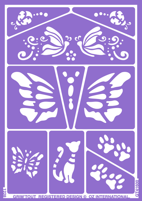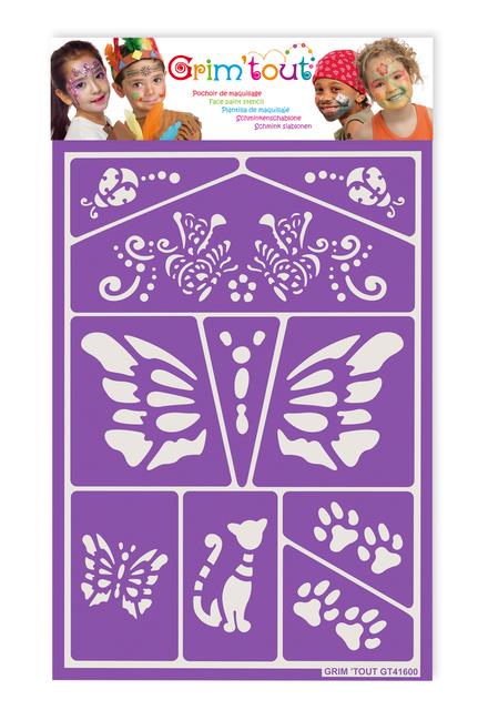 GRIM'TOUT vereenvoudigt het leven van moeders, leerkrachten en animatoren met zelfklevende, wasbare en herbruikbare make-up stencils! De sjablonen zijn van cosmetische kwaliteit, zeer flexibel en passen zich aan elk deel van het gezicht aan, met een frontaal patroon en andere voor de wangen. De make-up kan met een kwastje of sponsje op het sjabloon worden aangebracht en maakt het mogelijk om elke keer weer snel een geslaagde make-up te krijgen! Elke make-up stencil wordt geleverd met gebruiksaanwijzing en illustraties.